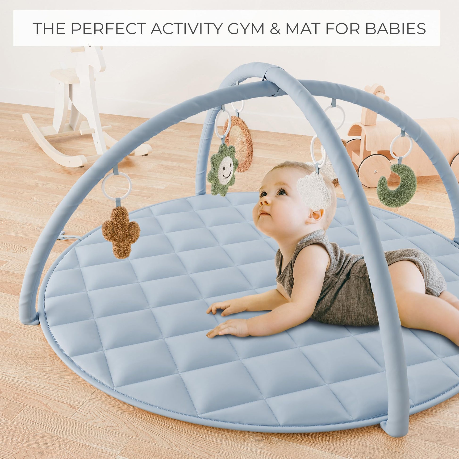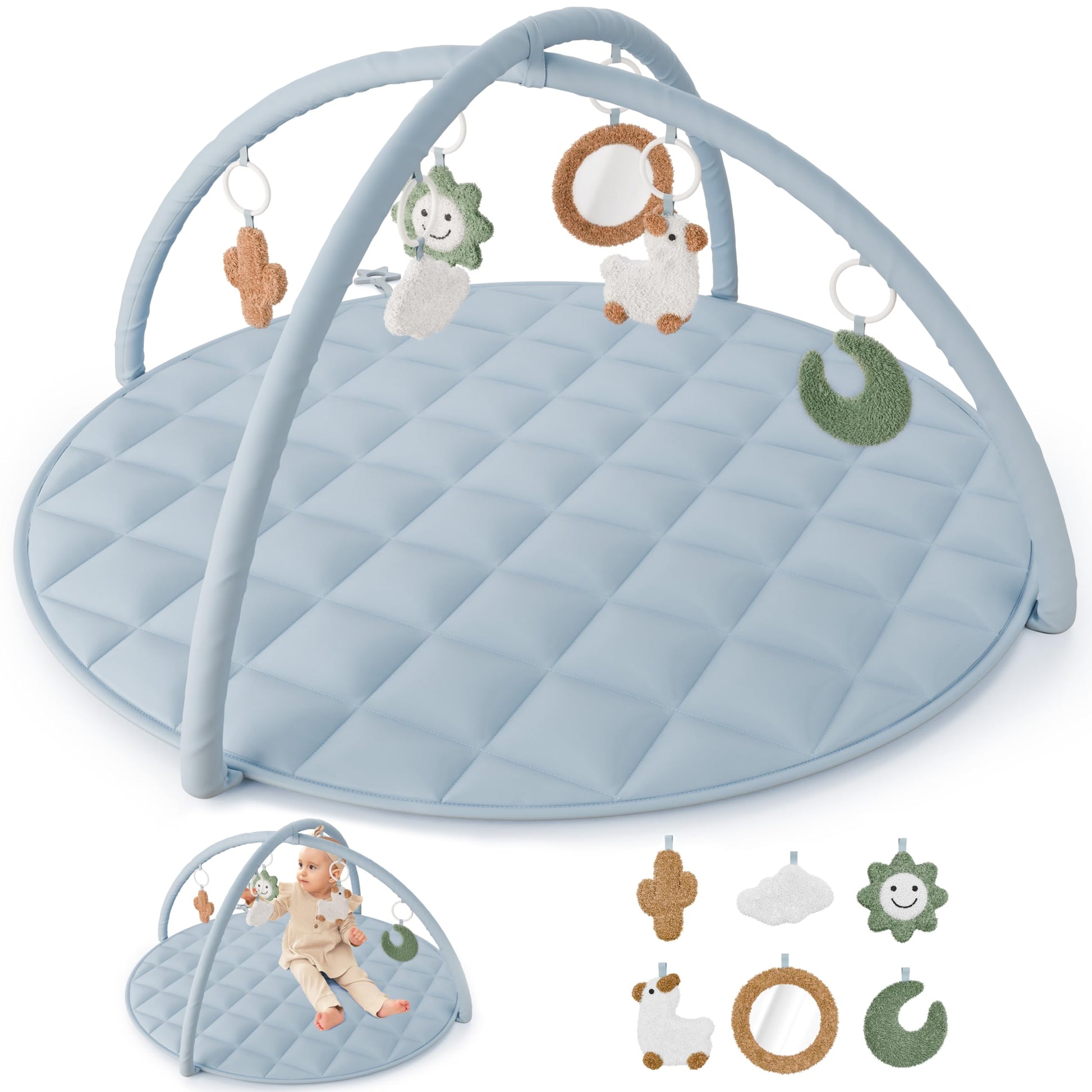 Stylish Design with Adorable Toys: Super cute! The playmat for babies boasts 6 charming toy attachments and a mirror. With its lovely blue design, it suits great for girls and at 35x35” it offers ample space for exploration & play