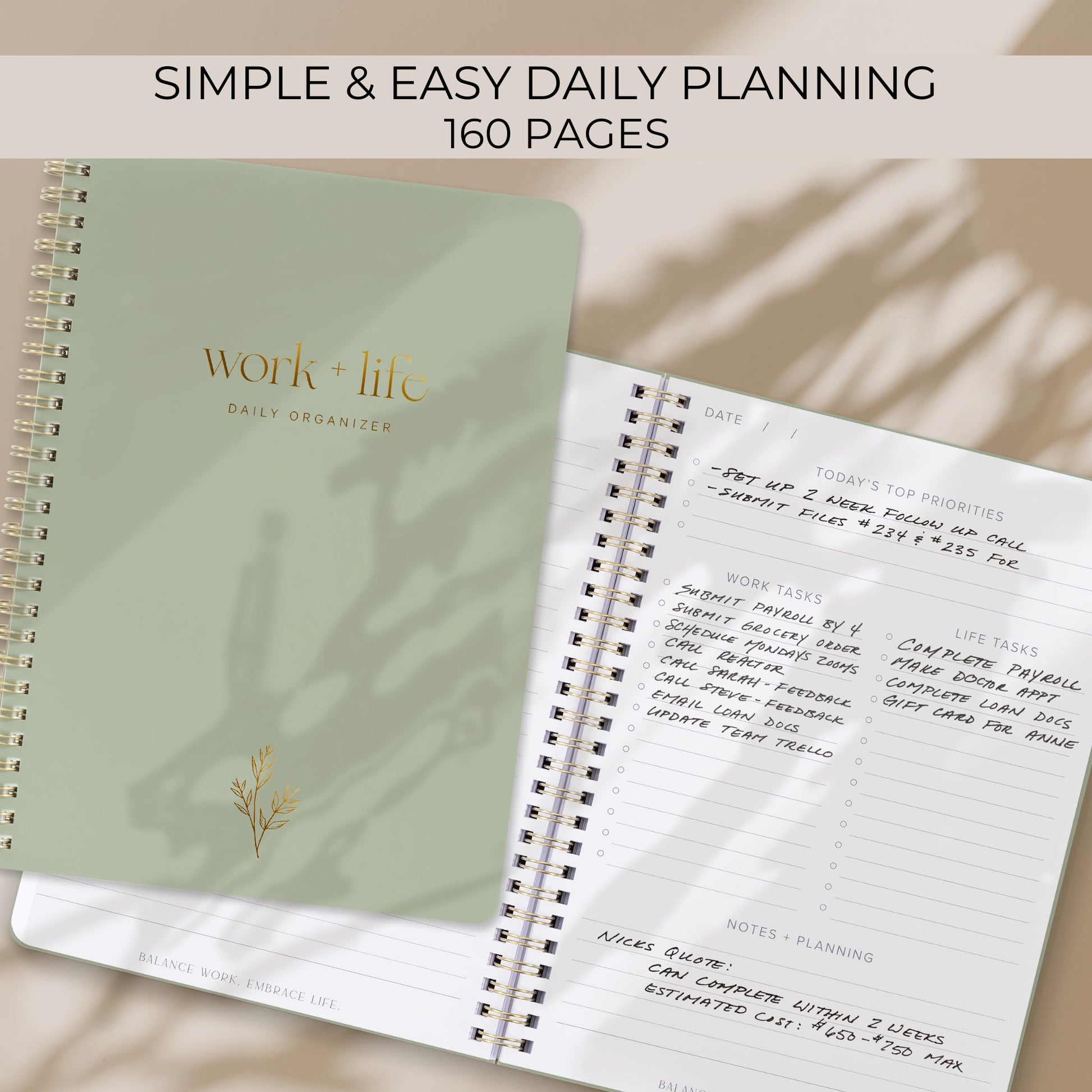 Beautiful Design for Daily Motivation: The undated planner features a modern sage cover, shiny gold foil accents and a chic gold spiral binding, adding flair to your routine. The to do list notebook elevates your daily journal, aiming for genuine work-life balance