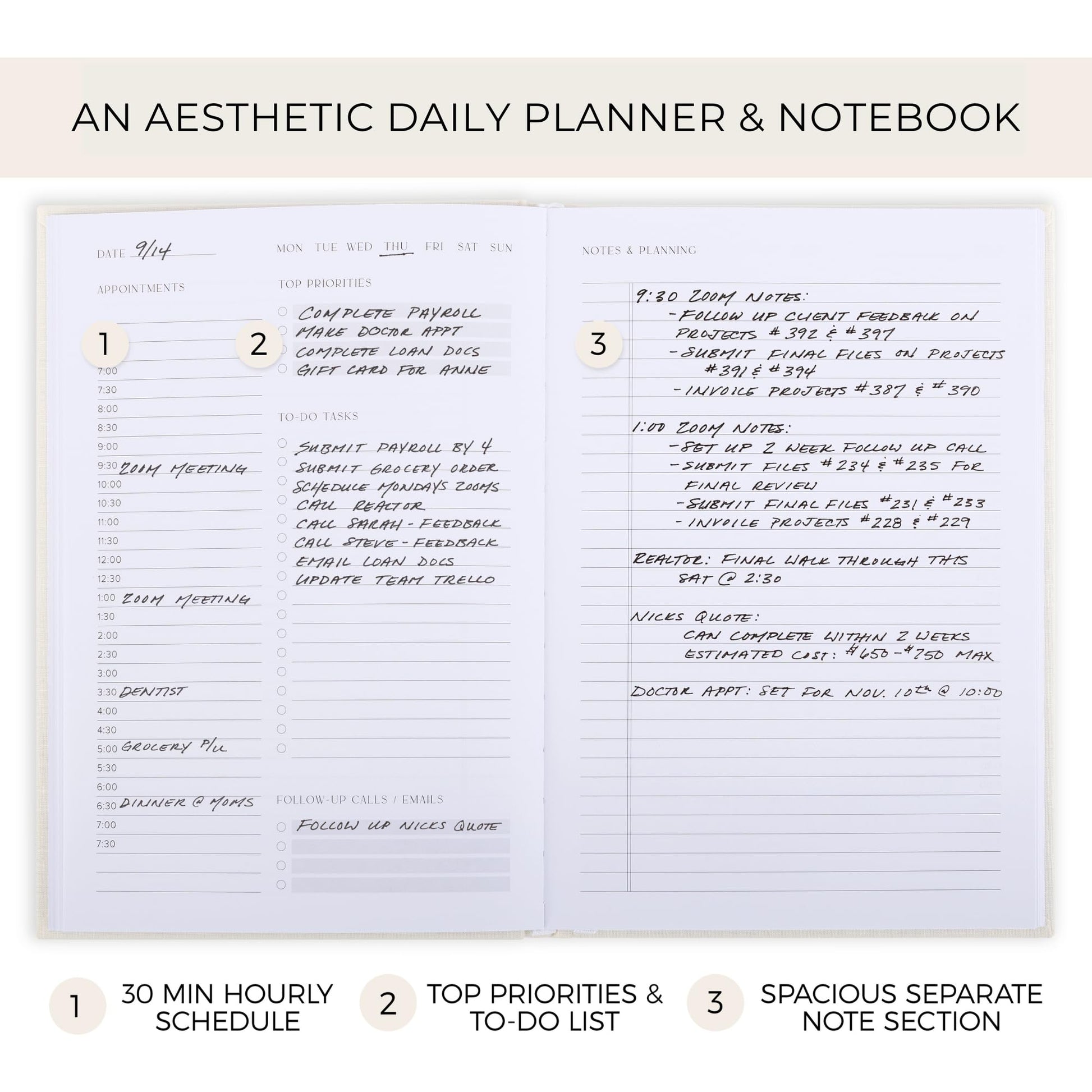 Smartly Plan Ahead & Boost Your Productivity: Absolutely clever & efficient! With the planner notebook you can break down your daily tasks into half-hourly focus blocks and map out priorities & follow-up duties to keep your day on track and enhance productivity