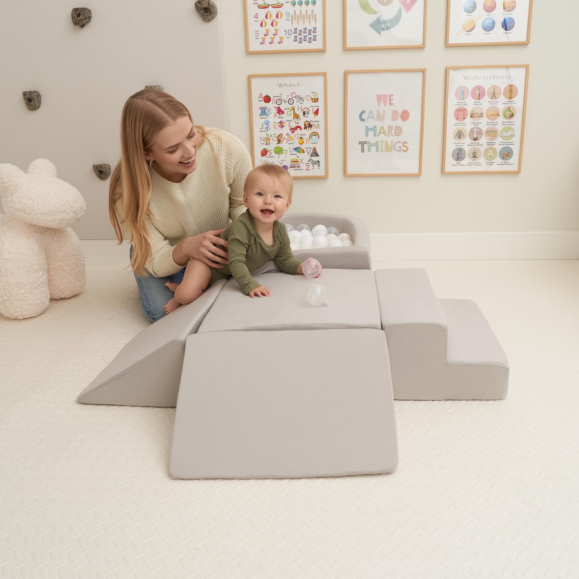 Ultimate Indoor Play Area: Create your toddler’s dream play zone with the baby climbing toys indoor set! The soft play equipment comes with a big square, a step, two triangles & a ball pit for up to 100 balls (not incl.). Endless climbing fun awaits your little one