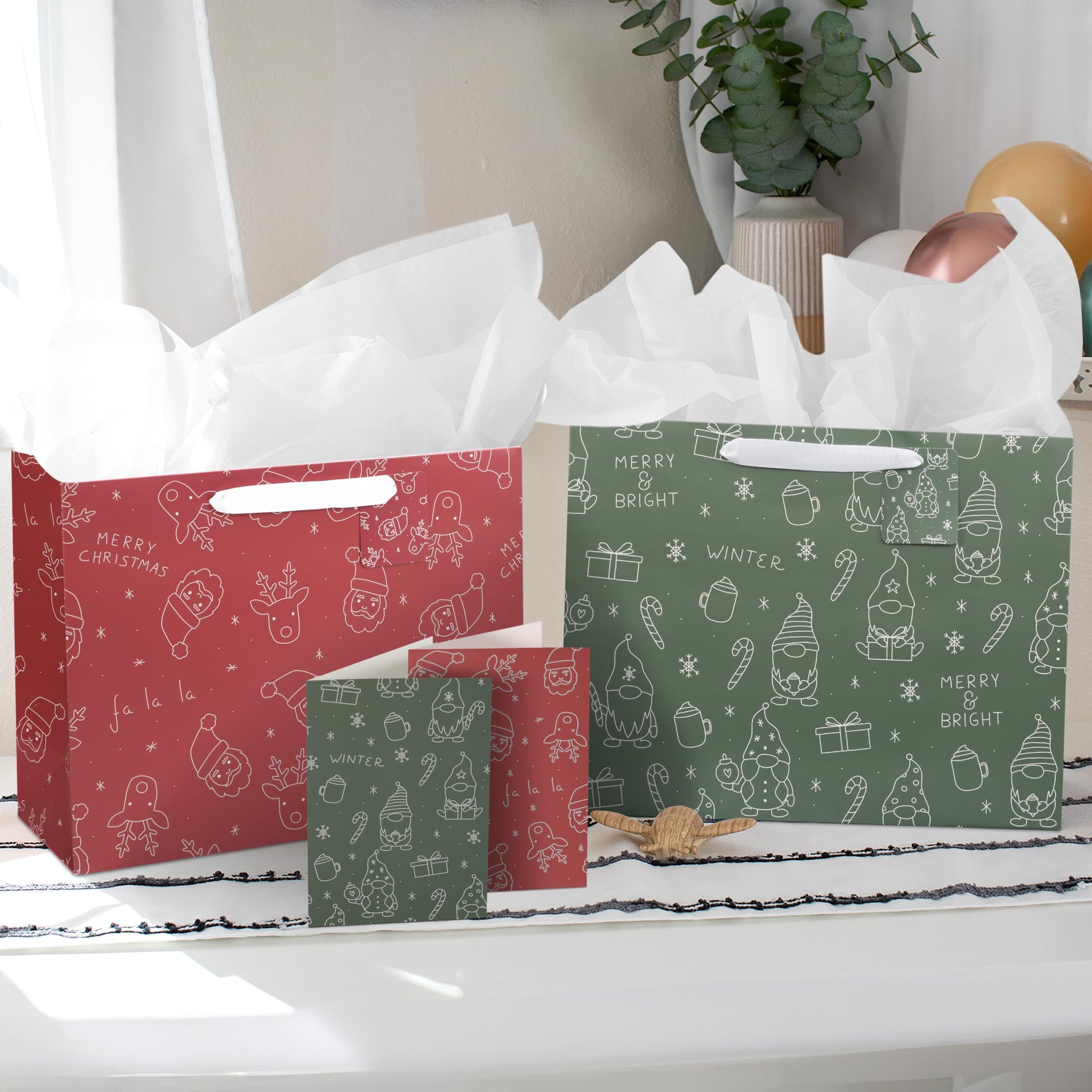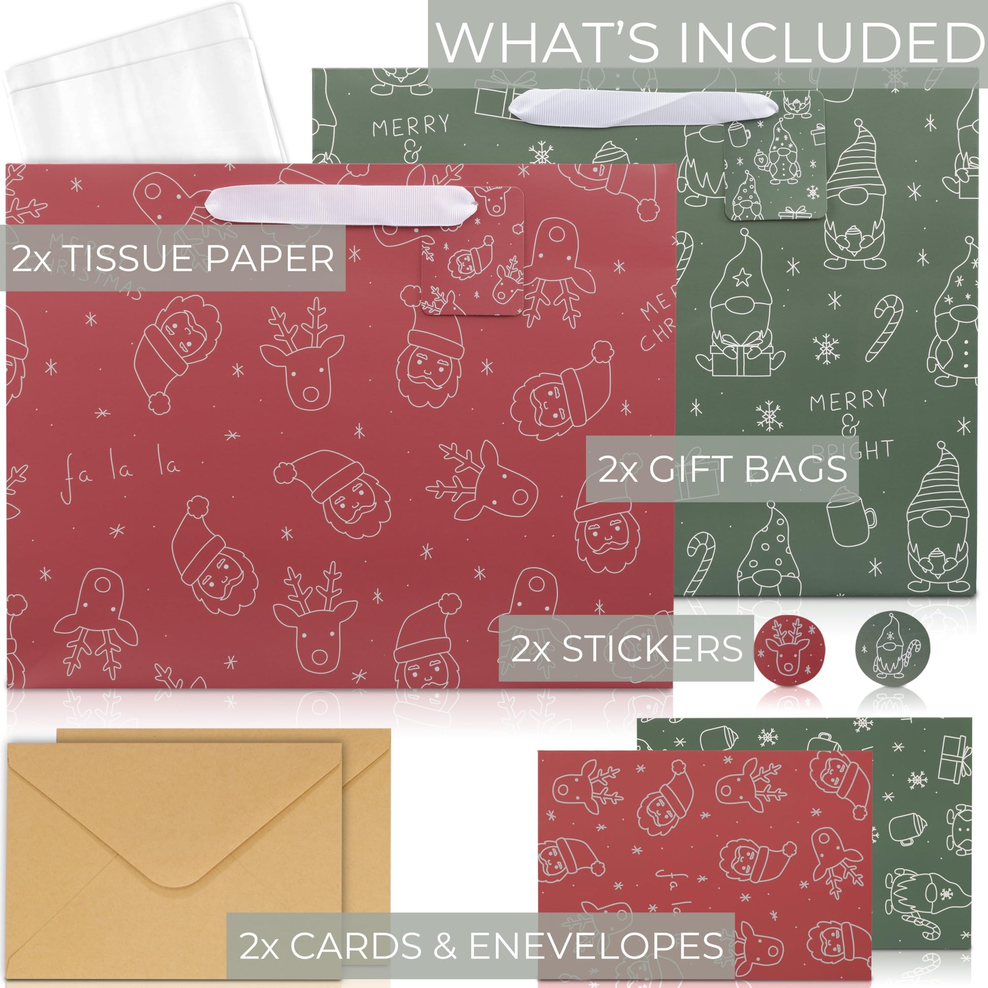 Effortless, Festive Gift-Giving: All-in-one Christmas Joy! ZICOTOs’ set has everything you need to wrap up the holiday spirit (& gifts) - two 10.2x12.9x4.76" Christmas gift bags with handles & tags, tissue paper, festive cards with envelopes and cheerful stickers