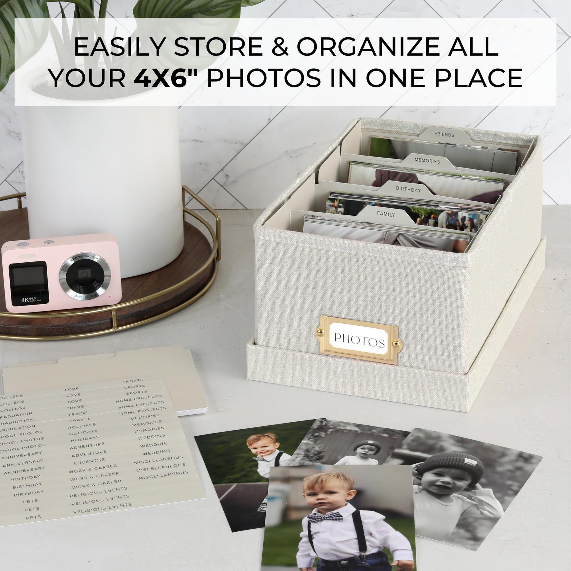 ZICOTO Decorative Photo Storage Box - Sturdy Linen Photo Organizer with Dividers is Perfect to Store Up to 850 Pictures and 4x6 Photos - Portable Scrapbook Storage Containers with Lid
