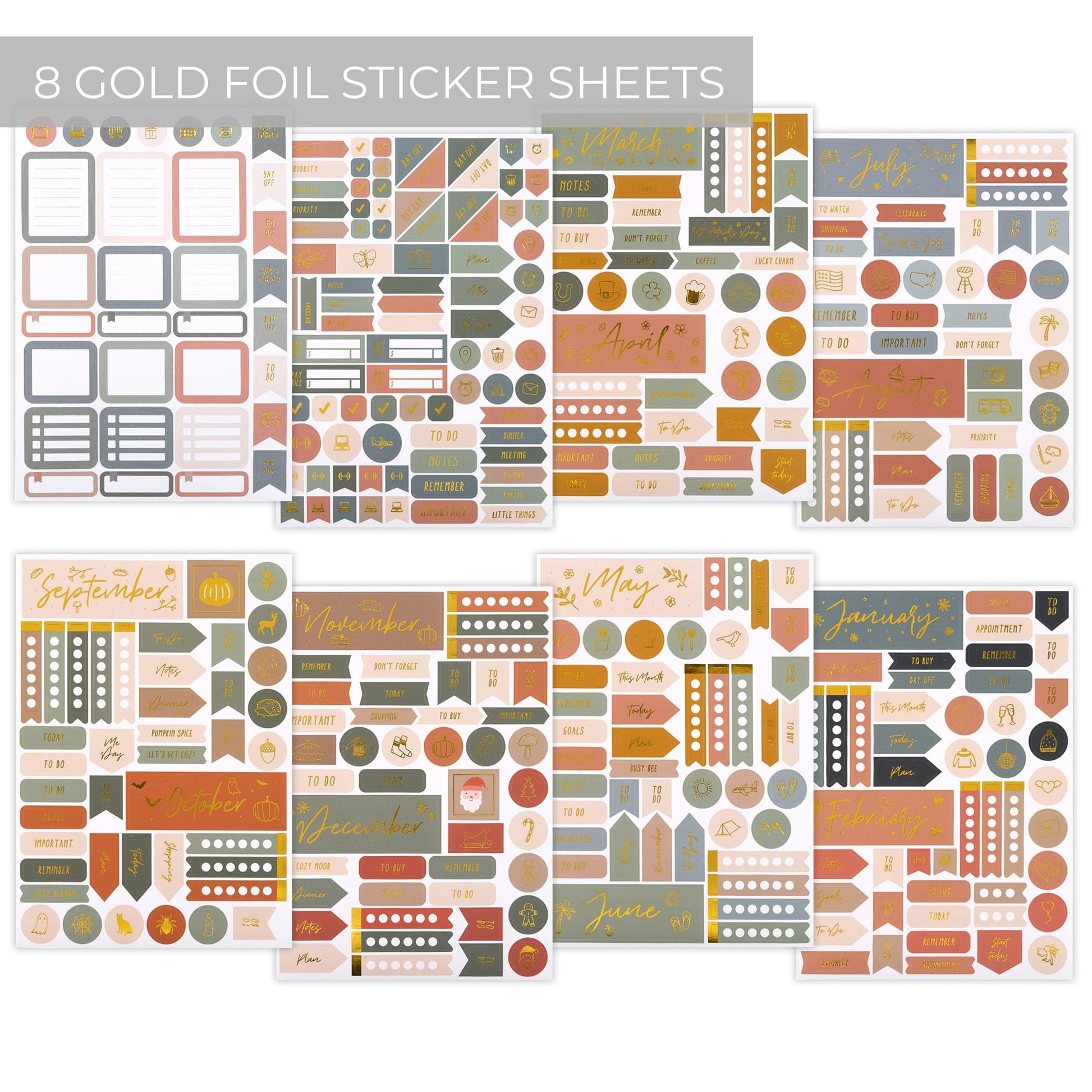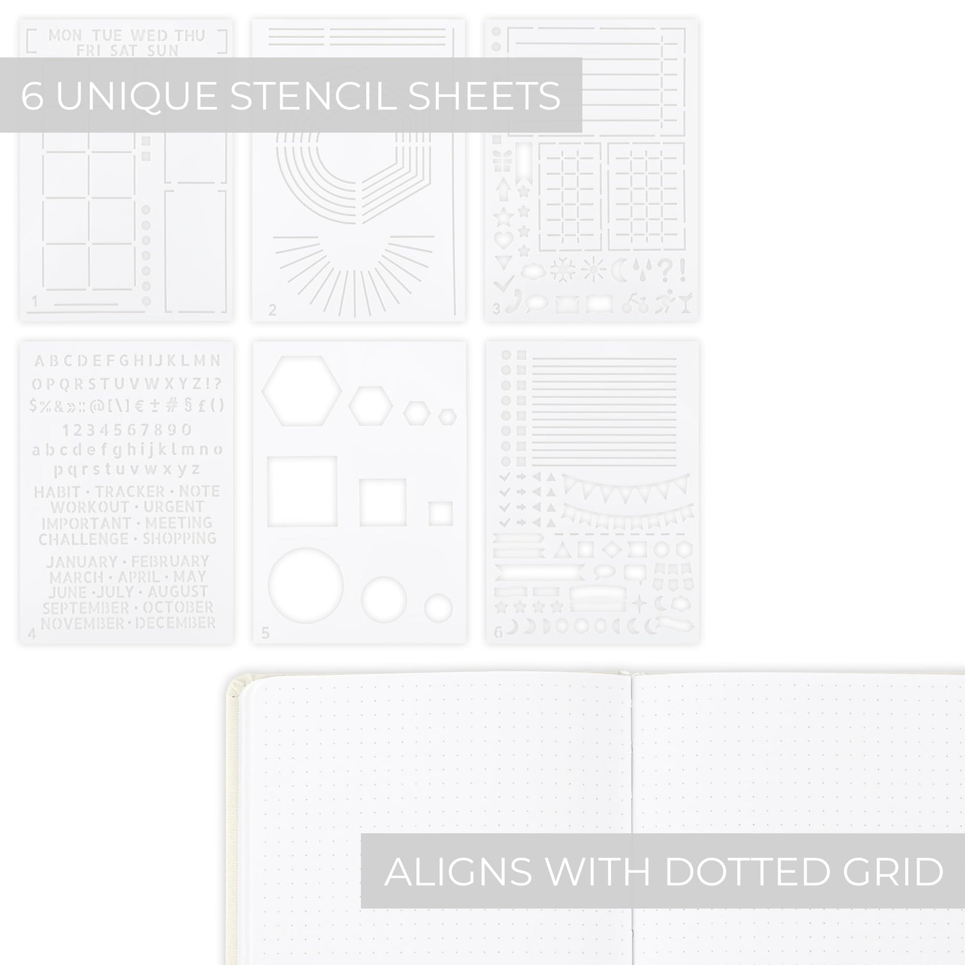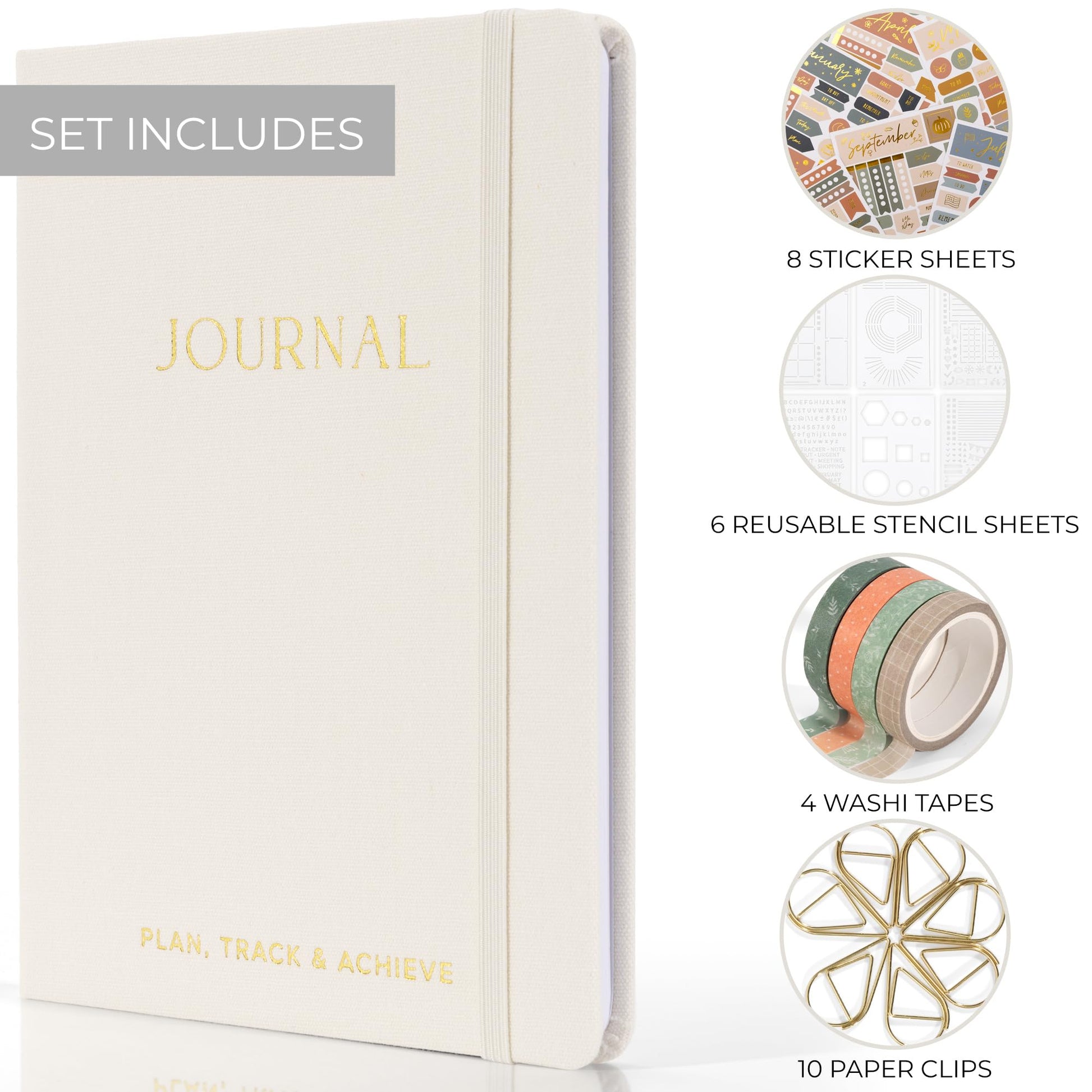 ZICOTO Ultimate All-in-One Journaling Kit - Incl. Journal Notebook With Linen Hardcover and Dotted Pages, Stencils, Stickers, Washi Tapes, Paper Clips and More Bullet Checklist Supplies
